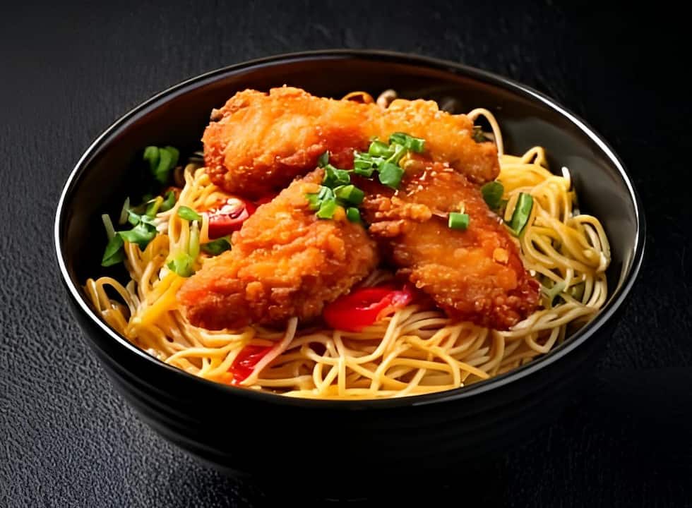 Chicken hakka noodles in fried rice and noodles.