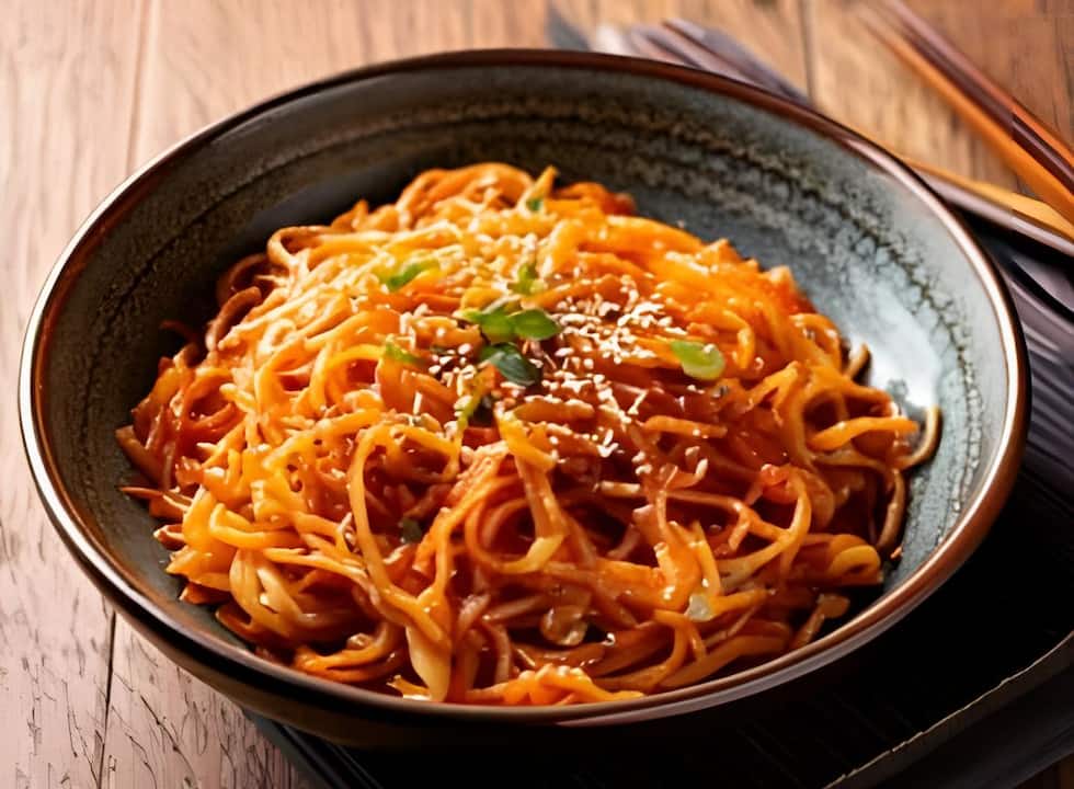 Chicken schezwan noodles in fried rice and noodles.